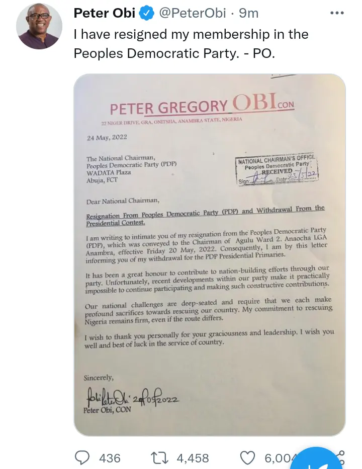 Barely 72 hours before the Peoples Democratic Party (PDP) National Convention, the former governor of Anambra State and PDP presidential aspirant, Peter Obi officially resigned his membership of the party.