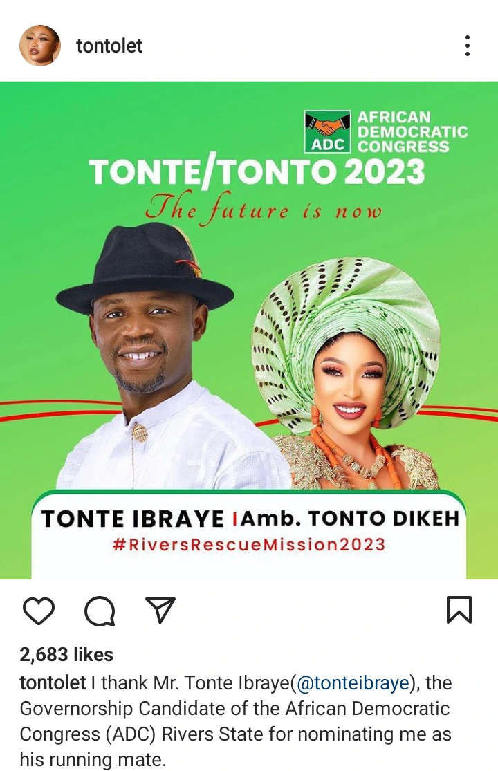 However, as a step further to her career, she was nominated to be the running mate of a Governorship candidate in Rivers State ahead of the 2023 elections in the state. The candidate of ADC (African Democratic Congress) in the forthcoming Rivers Governorship election (Tonte Ibraye) nominated Tonto Dikeh to be his running mate.